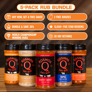 Get FIVE of our best-selling, award-winning bbq rubs with this 5 pack combo PLUS one free bbq sauce of your choice AND two free koozies for just $49.75! That's over $23 worth of free stuff... and who doesn't love free stuff?