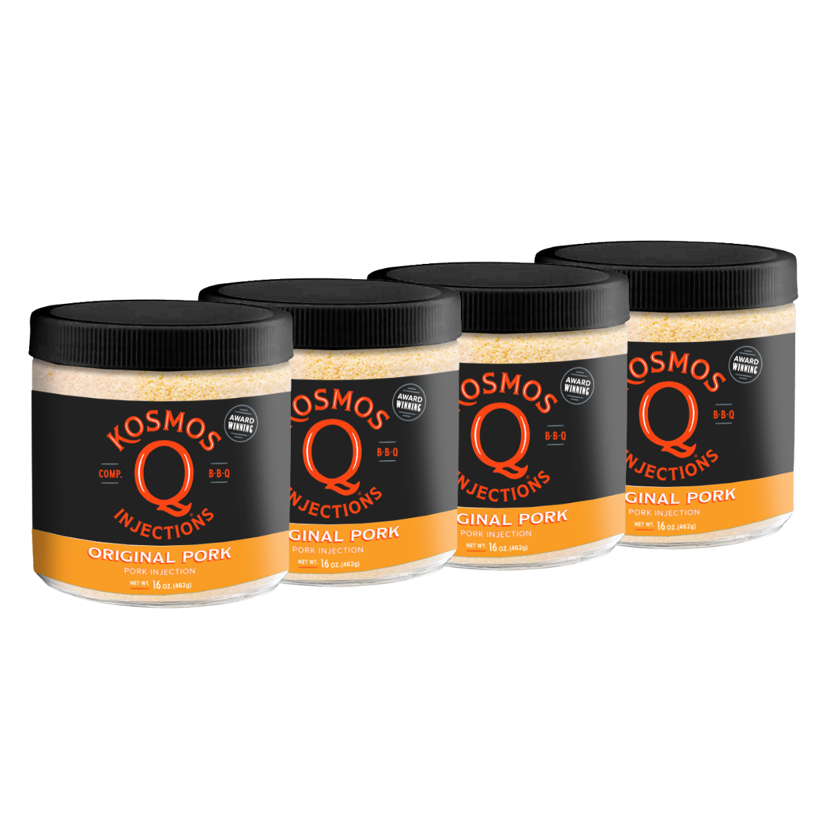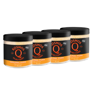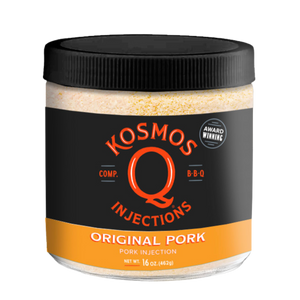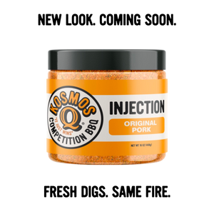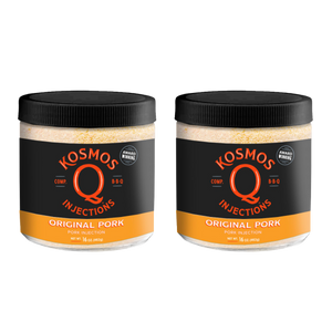 Nothing says "Heaven on earth" quite like tender pork ribs and loins, and nothing makes them tender like a premium injection. Using a special home blend of all-natural salts and spices primed for maximum moisture retention, combined with the smoky sweetness of brown sugar and top-quality pork stock, brace yourself for a pulled pork injection that gives a whole new meaning to the phrase "fall-off-the-bone." Perfected by a competition pit-master, FOR competition pit-masters, there aren't many other clear-cut ways to secure your throne as Ruler of the Grill. You know your ribs are headed in the right direction when you choose to use Kosmos Q Pork Injection!