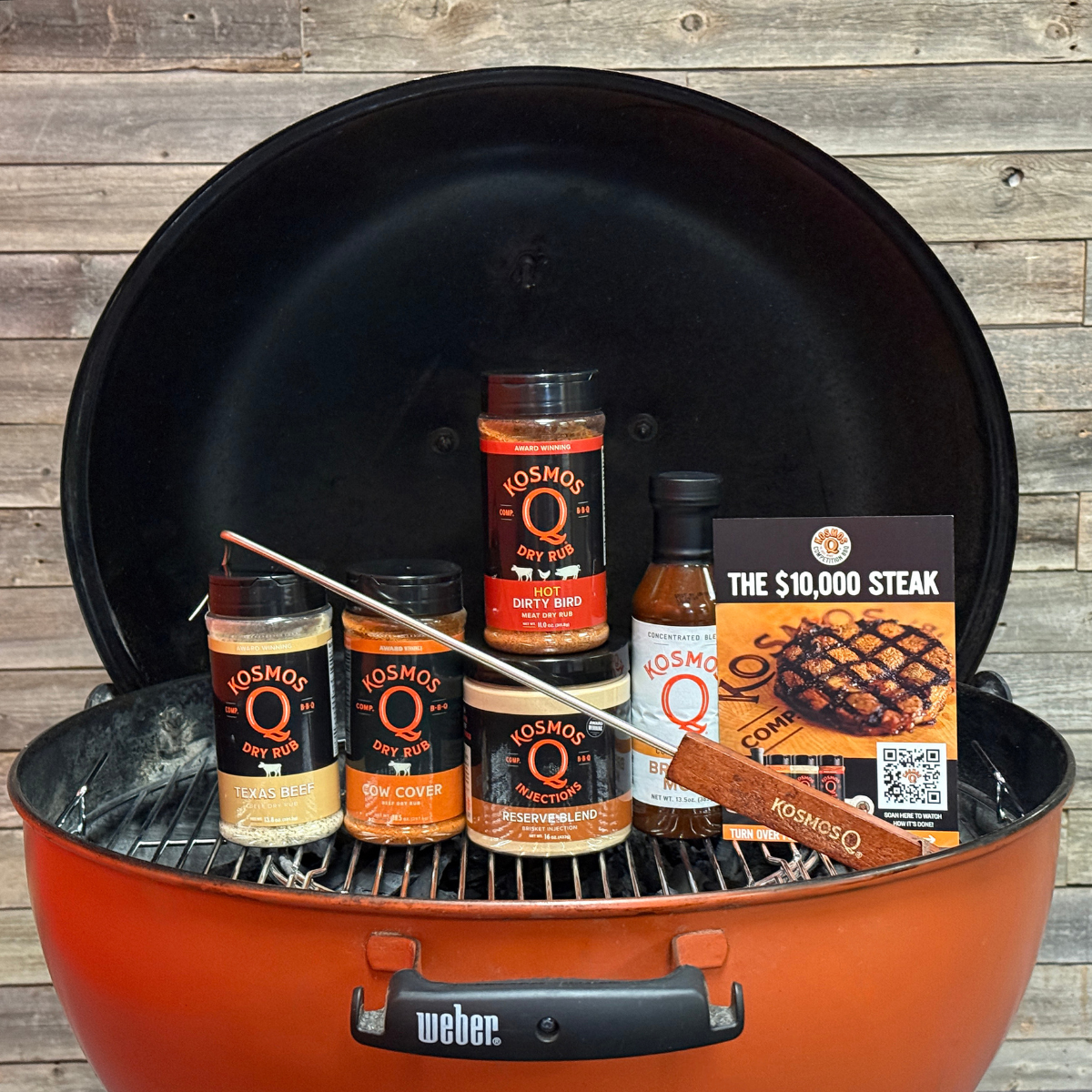 A championship-ready kit featuring Cow Cover, Dirty Bird Hot, Texas Beef rub, Brisket Mop, Reserve Blend Brisket Injection, Pigtail flipper, and recipe cards. Inspired by Kosmos’ $10,000 steak win, this kit is the ultimate flex for any griller ready to up their game.