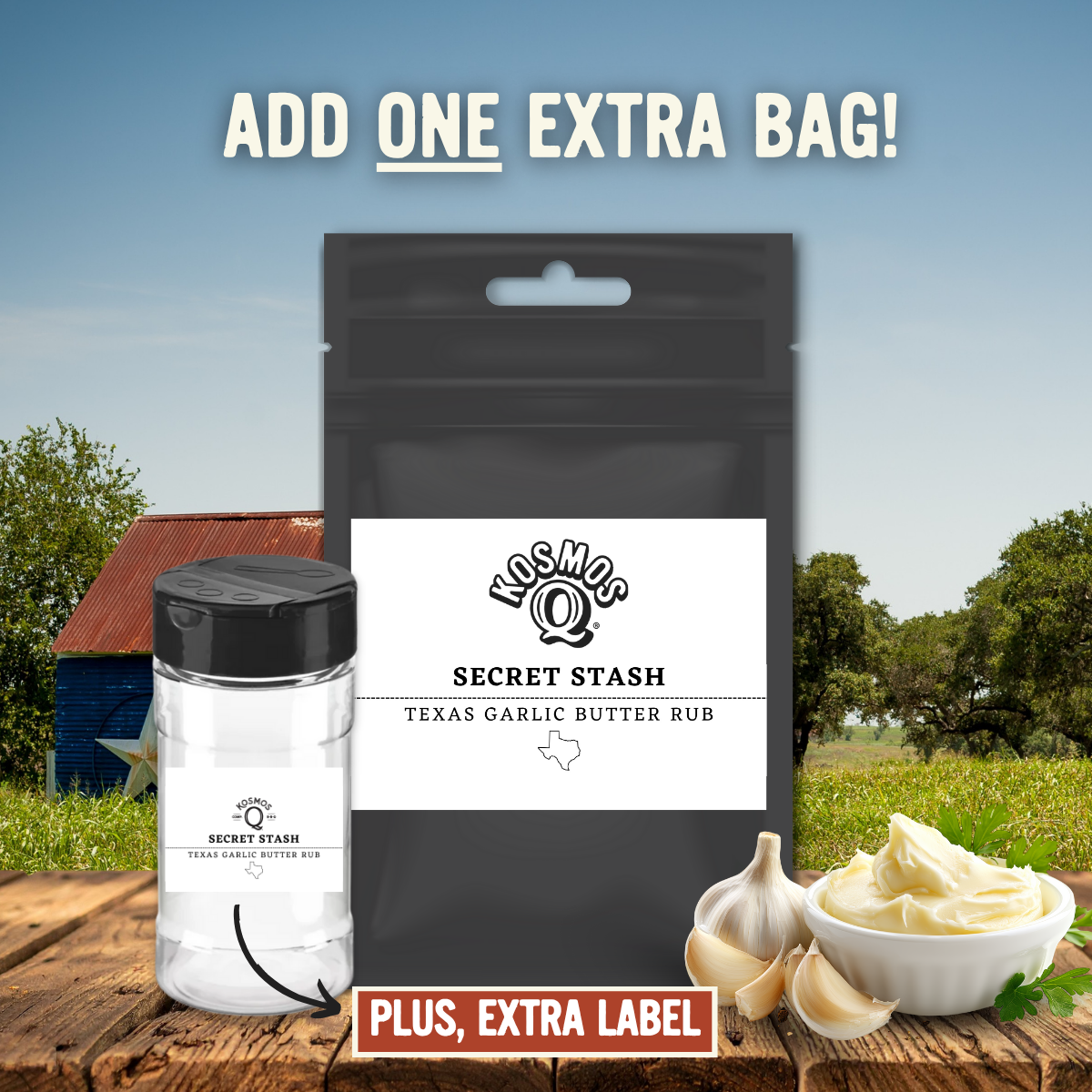 Get an extra bag of our SMALL BATCH, Kosmos Q Lab exclusive Texas Garlic Butter Rub before it's gone! This time, you're also getting an empty shaker and an extra label with this additional bag.