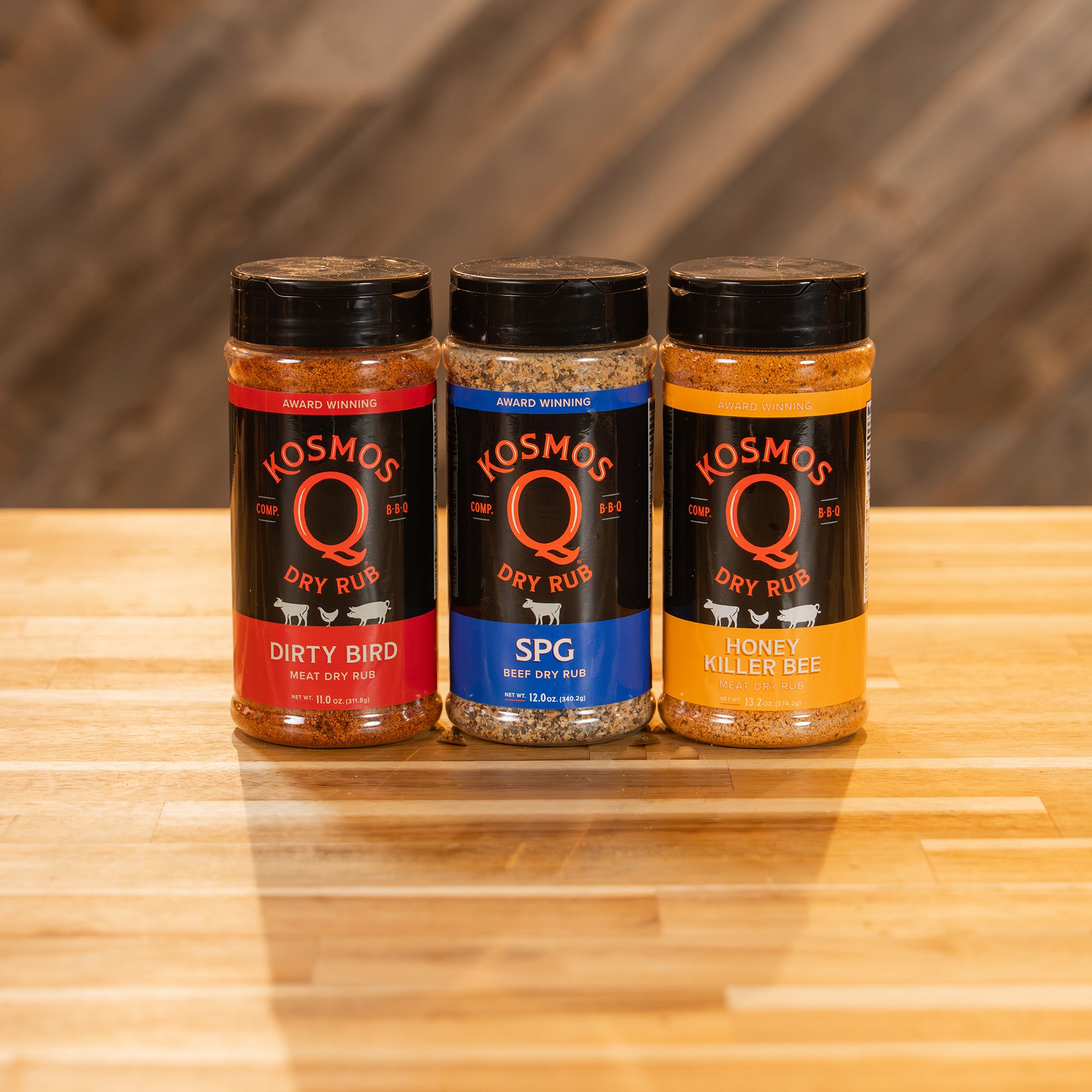 What it is: Three of Kosmos Q’s most loved mild rubs — Dirty Bird, SPG, and Killer Bee — bundled for the holidays.