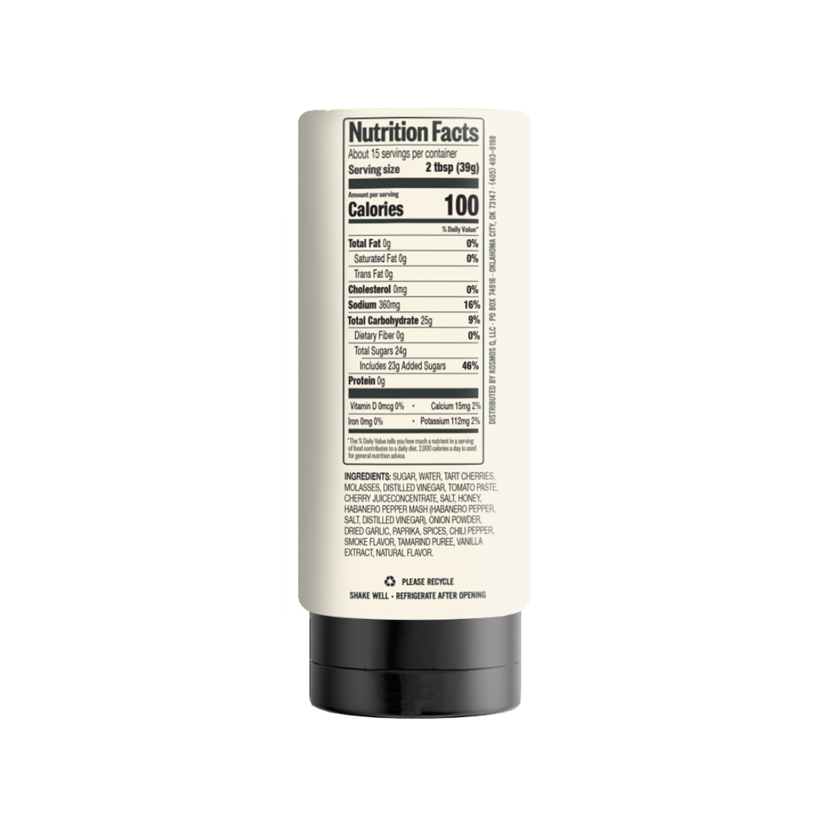 INGREDIENTS: SUGAR, WATER, TART CHERRIES, MOLASSES, DISTILLED VINEGAR, TOMATO PASTE, CHERRY JUICE CONCENTRATE, SALT, HONEY, HABANERO PEPPER MASH (HABANERO PEPPER, SALT, DISTILLED VINEGAR), ONION POWDER, DRIED GARLIC, PAPRIKA, SPICES, CHILI PEPPER, SMOKE FLAVOR, TAMARIND PUREE, VANILLA EXTRACT, NATURAL FLAVOR.