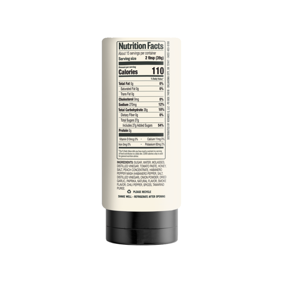 INGREDIENTS: SUGAR, WATER, MOLASSES, DISTILLED VINEGAR, TOMATO PASTE, HONEY, SALT, PEACH PUREE, HABANERO PEPPER MASH (HABANERO PEPPER, SALT, DISTILLED VINEGAR), ONION POWDER, DRIED GARLIC, PAPRIKA, NATURAL FLAVOR, SMOKE FLAVOR, CHILI PEPPER, SPICES, TAMARIND PUREE.