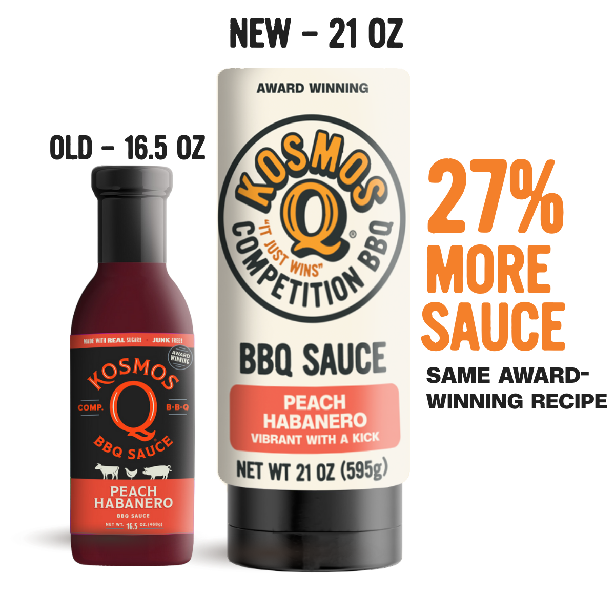 We didn't mess with the recipe; we just took our Peach Habanero BBQ Sauce that brings home trophies on the bbq competition circuit and mouths watering around your kitchen table, and made it even bigger. Now, you're getting more of the Peach Habanero BBQ Sauce you know and love in our first-of-its-kind squeeze bottle, so you've got even more to work with every time you cook. Nothing fancy. Nothing changed. Just more of what already wins.