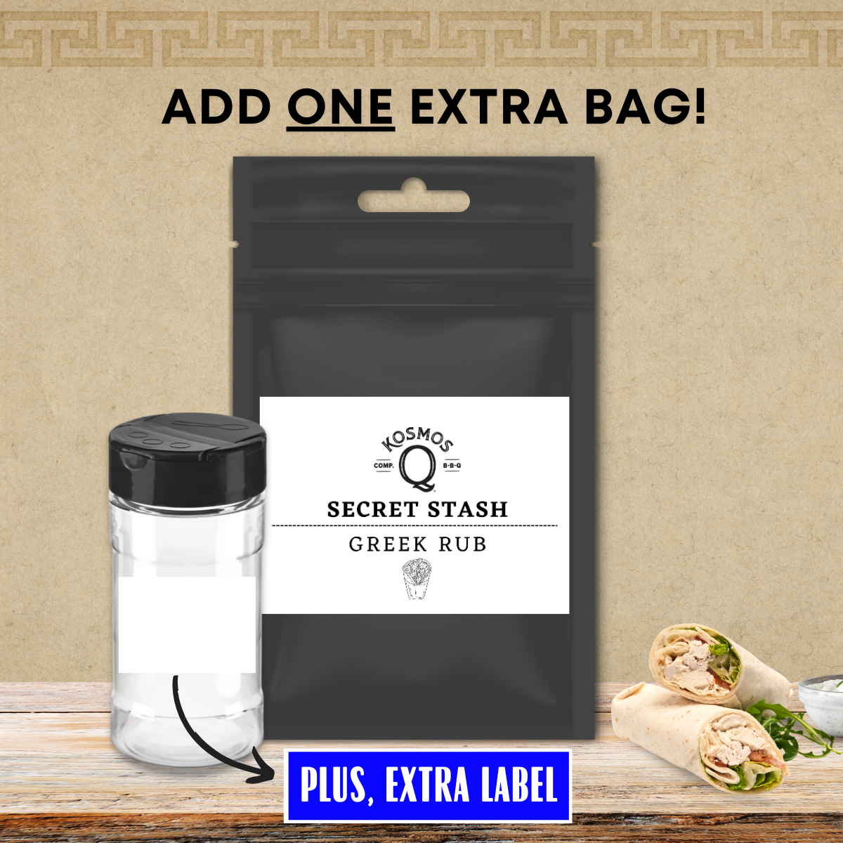 Greek rub before it's gone! This time, you're also getting an empty shaker and an extra label with this additional bag.